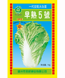 “早熟五号”是浙江省农科院研制的杂交一代大白菜优良品种,因该品种叶片厚、无毛、叶质软、净菜率高、风味佳、故也可以做小白菜栽培,并表现抗病性强,特抗炭疽病、病毒病、适于高温、多雨时节栽培,亩产